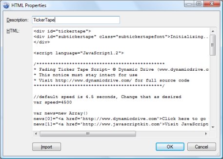 In WYSIWYG Web Builder we will use a HTML object to insert this code. Place the HTML object on the position where your want the ticker to appear.