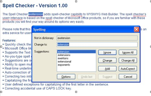 The Spell Checker extension adds spell-checker capability to WYSIWYG Web Builder. The spell checker’s user interface is based on the spell checker of Microsoft Office products, so if you are familiar with these products you will find your way around its options very easily.